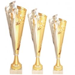 • Комплект подарочных кубков состоит из трех кубков из металлизированного пластика на основании из мрамора. Высота 300мм, 340мм, 360мм.