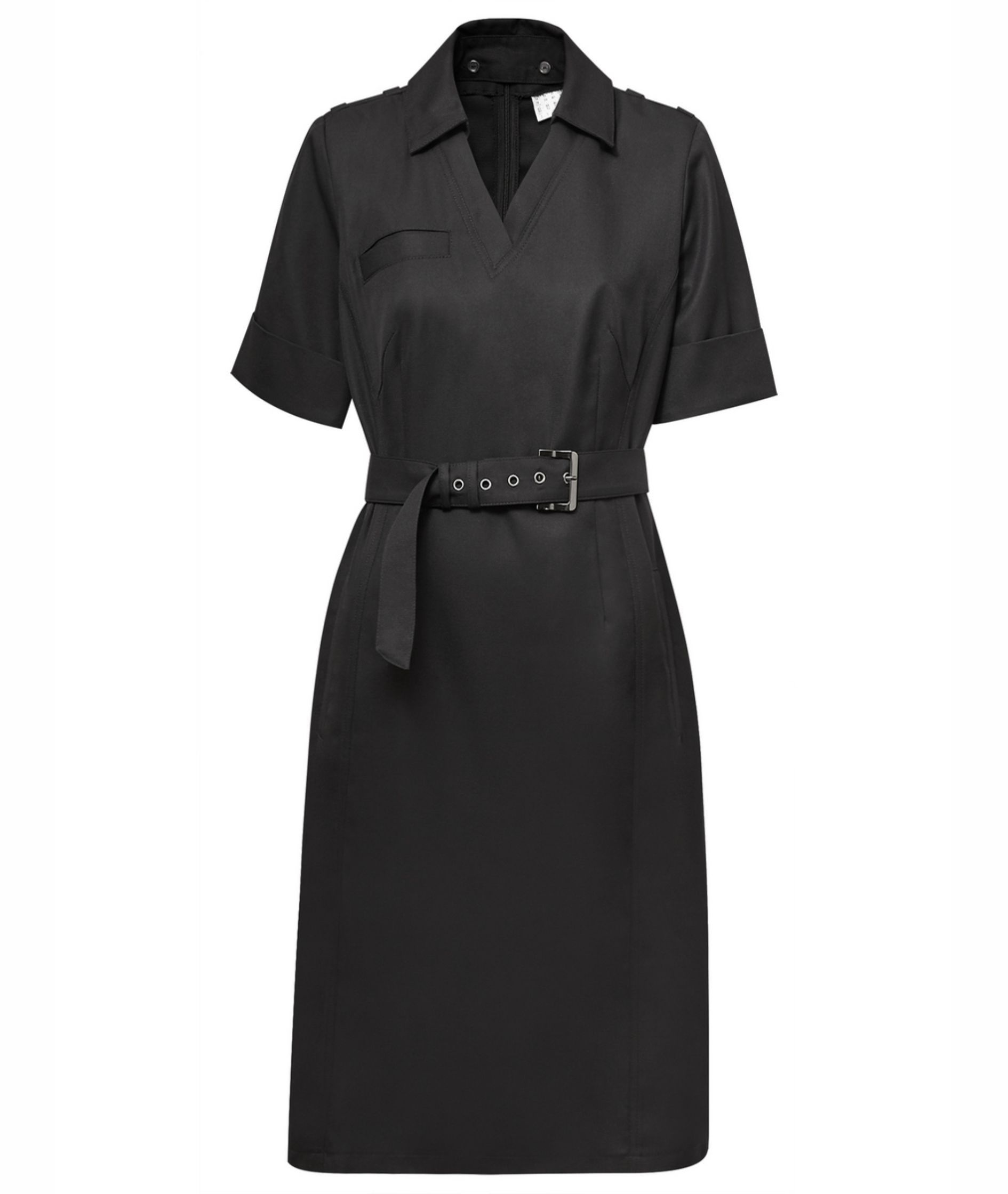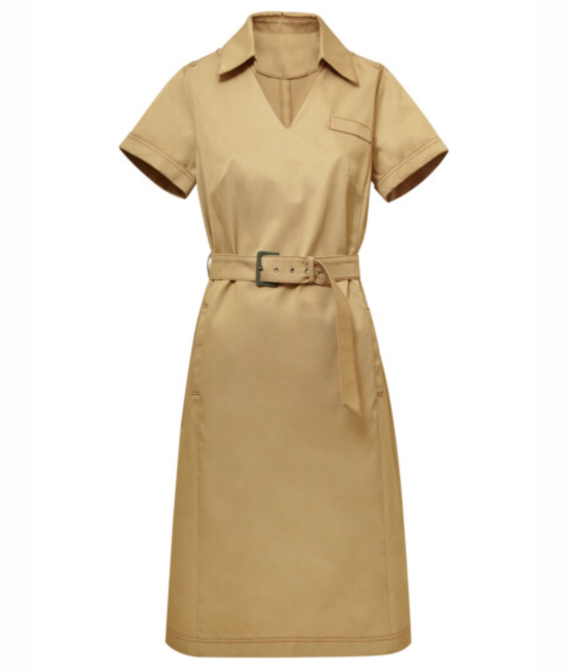 • платье полуприлегающего силуэта, с V-образным вырезом горловины переда, с притачным на стойке воротником, с поясом, застегивающимся спереди на пряжку.