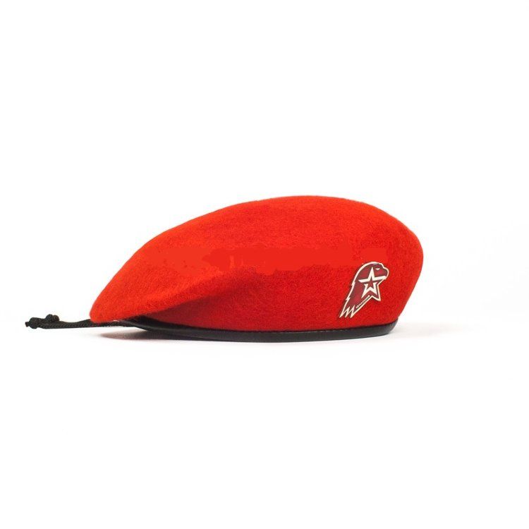 • Берет бесшовный красный в комплекте с большим значком. Формованный, имеет два вентиляционных отверстия, кожаная окантовка, утягивающий шнурок. Размеры с 53 по 60.